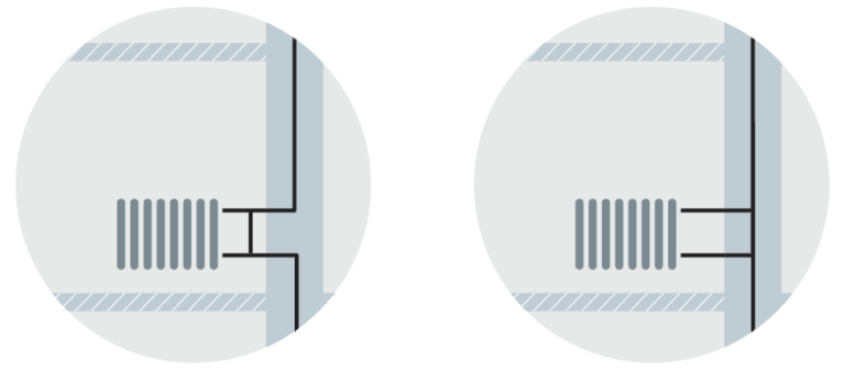 В некоторых случаях стояки проходят внутри стены, и вы не можете их видеть. Признаком однотрубной системы в этом случае будет являться наличие перемычки. Если ее не видно (как на фото справа), то лучше всего сделать запрос о типе системы в управляющую компанию.