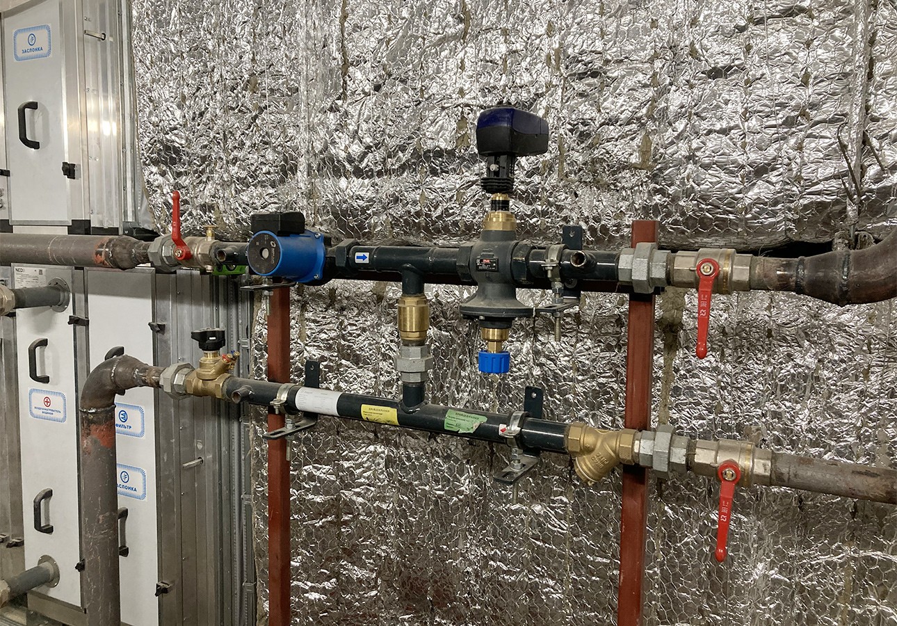 Еще одна важная составляющая инженерных систем этого здания — это центральные кондиционеры, приточные установки и фанкойлы. Их применение весьма актуально для деловых центров, пропускная способность которых выше, чем у обычных жилых домов. Индивидуальное качественное регулирование теплоносителя у каждой приточной установки осуществляет смесительный насосный узел Ридан АУУ-AQT.