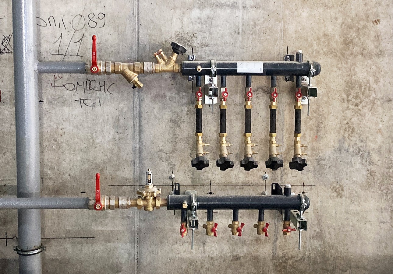 Балансировку системы отопления между этажами осуществляют автоматические клапаны поддержания перепада давления APT-R, установленные перед коллекторами. Ручные балансировочные клапаны MVT-R на ответвлениях от коллекторов позволяют точно распределить теплоноситель согласно расчетным параметрам. Автоматические воздухоотводчики обеспечивают своевременный сбор и удаление воздуха из системы отопления, а шаровые краны — надежное перекрытие.