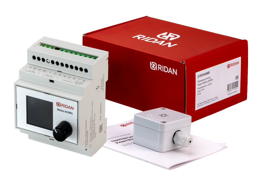 В комплекте — датчик температуры наружного воздуха (10 кОм, IP65), а датчик кровли Ридан Roof 850R и датчик грунта Ридан Ground 850RG приобретаются отдельно.